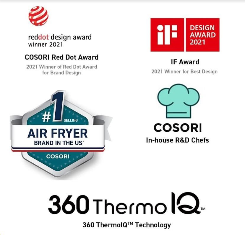 Design horkovzdušné fritézy COSORI CAF-P583S byl navržen v Kalifornii. Díky své praktičnosti, funkcím, ovládání i přehlednému nakloněnému dotykovému LED displeji se snadno přístupnými tlačítky získal také prestižní ocenění Red Dot Award za nejlepší design.