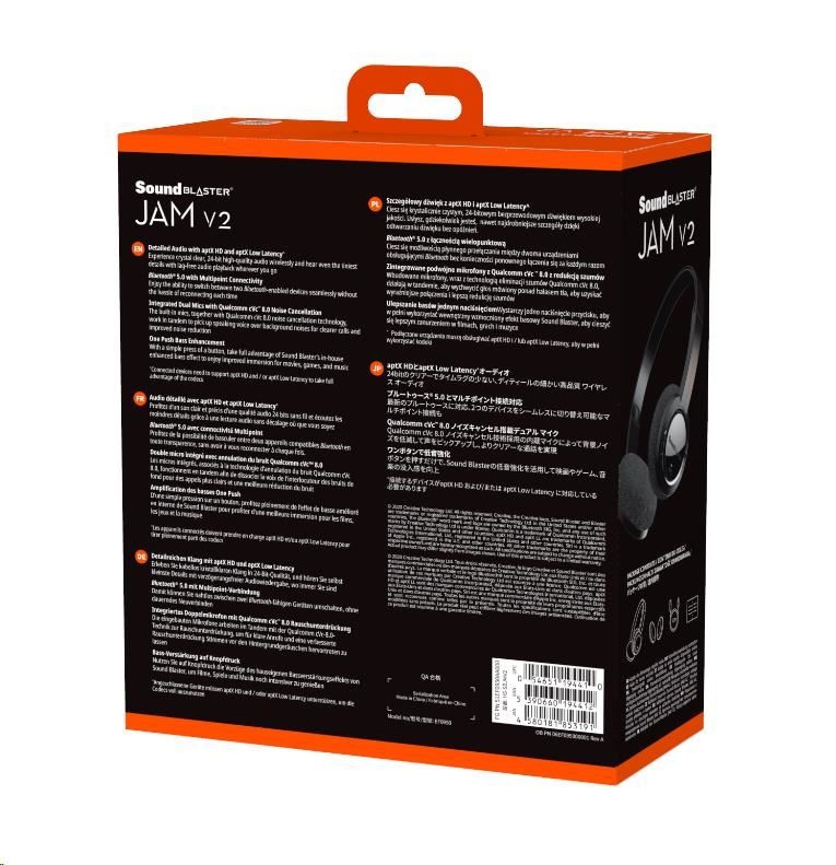 Vaše oblíbená přenosná Bluetooth® sluchátka na uši jsou zpět – se stejným designem lehkým jako pírko a vysoce kvalitními neodymovými měniči! Produkt Sound Blaster JAM V2 je nyní vybaven technologií Bluetooth 5.0. Společně s rozšířenými zvukovými kodeky aptX™ HD a aptX™ Low Latency poskytuje nejlepší bezdrátový poslech. Užijte si bohatý a dechberoucí zvuk. Funkce Multipoint umožňuje zřetelně přepínat mezi dvěma různými zdrojovými zařízeními Bluetooth, aniž byste vyšli z rytmu.