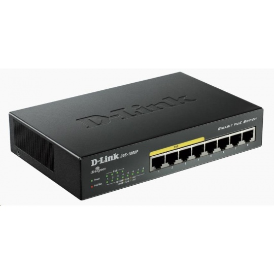 D-Link DGS-1008P 8-port Gigabit Desktop Switch, 4 porty jsou PoE+, PoE budget 68W