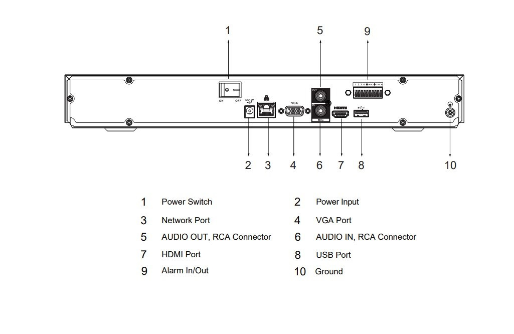 1× 10/100/1000 MbE RJ-45, 1× audio vstup (RCA), 1× audio výstup (RCA), 4× alarm vstup, 2× alarm výstup, 2× USB 2.0, pozice pro 2× SATA HDD (max. 20 TB/disk), 1× HDMI, 1× VGA.