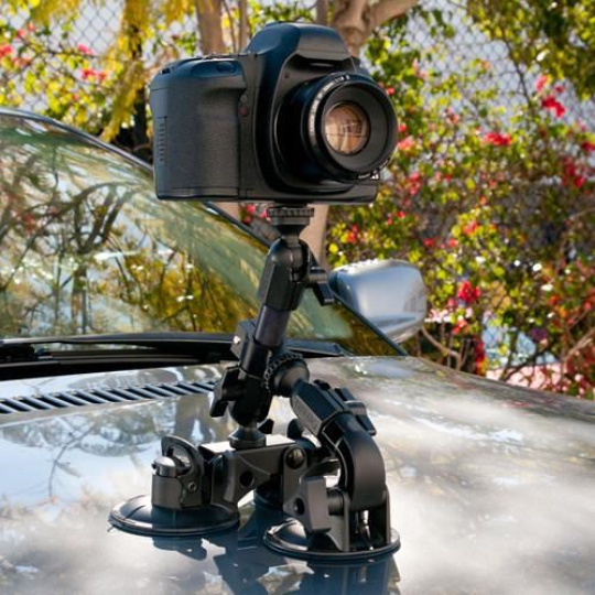 Delkin Devices Fat Gecko Triple Mount is designed to hold DSLRs and camcorders up to 5kg. The mount combines a Fat Gecko Original with a Fat Gecko Mini mount, and a slide and lock design ensures secure attachment between the two mounts. By combining the two into one mount, Delkin has created a sturdy mount that affords three industrial locking suction cups for increased stability. Plus, the suction cups can adjust to the contours of your smooth, non-porous shooting surface. The mount locks into place and features six adjustable points, which ensures you'll get the mount set to the perfect angle for every shot. The mount also features a standard 1/4"-20 tripod head for universal compatibility. A rubber washer and tightening knob provide added vibration dampening as well.