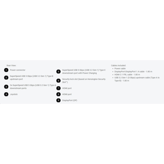 | Power cable ? DisplayPort-DisplayPort 1.4 cable - 1.80 m ? HDMI 2.1 FRL cable - 1.80 m ? USB 3.2 Gen 1 (5 Gbps) upstream cable (Type A to Type B) - 1.80 m |