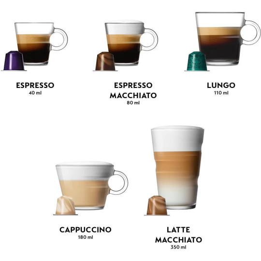 Kávovar na kapsle - na kapsle Nespresso Original, do domácnosti, příkon 1450 W, tlak 19 bar, objem nádržky na vodu 1 l, kontejner na 10 použitých kapslí, automatické vypnutí, s možností nastavení oblíbených nápojů, připravuje nápoj jedním stisknutím, nádoba na vodu a mléčné řešení, výškově nastavitelný podstavec, s manuálními tlačítky, nastavení velikosti nápoje.... více