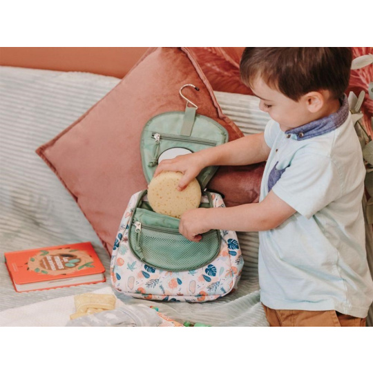 Kosmetická taška na zavěšení, v neutrální zelené barvě, s roztomilým lenochodem, je originální dětskou toaletní taškou na cesty. Velice pevná a odolná kosmetická taška, se spoustou kapsiček a odnímatelným zrcátkem, v pohodě pojme hygienické potřeby vaší holčičky nebo chlapce. Vodoodpudivý materiál umožní dětem používat tašku v koupelně i ve sprše. Díky háčku tašku jednoduše zavěsíte na háček nebo vodovodní baterii a děti mají své toaletní potřeby pohodlně po ruce..