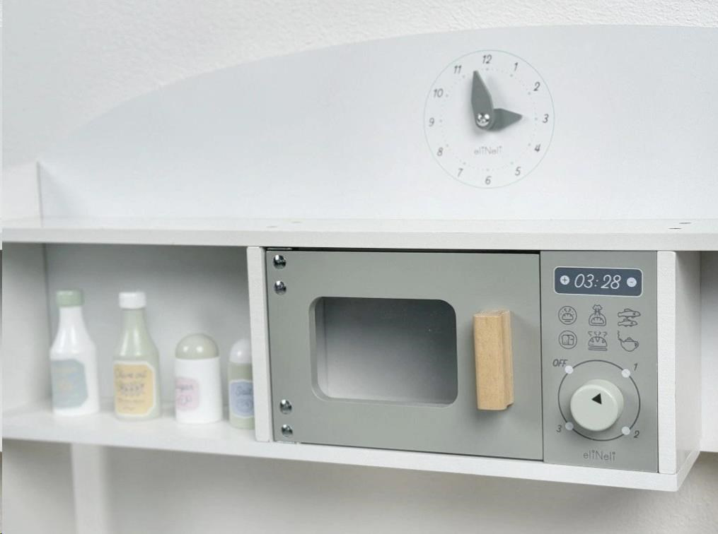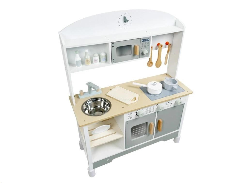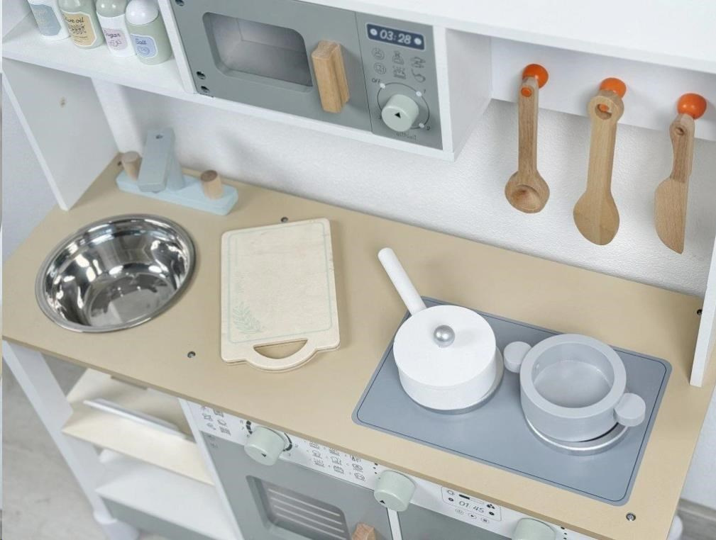 Dřevěná dětská kuchyňka v neutrální barevné kombinaci bílé a šedé barvy, doplněná bohatým příslušenstvím, je místem, kde vaše dítko může popustit uzdu své fantazii a kreativitě. Dětská kuchyňka se spotřebiči i nádobím je edukativní hračkou, která umožní dětem vyzkoušet si vaření, pečení a ostatní dospělácké činnosti bezpečným dětským způsobem. Díky přídavným nožkám (nástavcům) můžete kuchyňku zvednout o 6 cm.