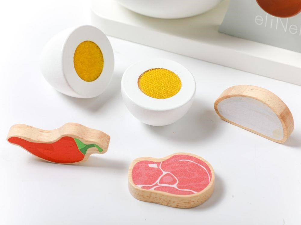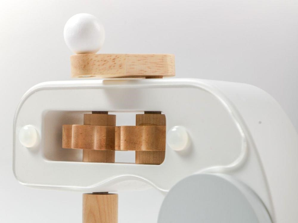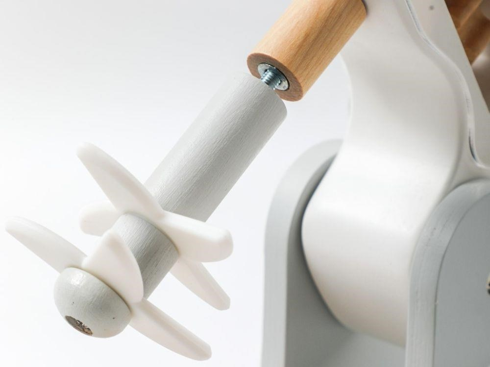 Dřevěný dětský mixér v moderní barevné kombinaci, v setu s dřevěným příslušenstvím, je edukativní hračkou, která umožní dětem vyzkoušet si práci s kuchyňským robotem bezpečným dětským způsobem. Otáčení páčky v horní části mixéru uvede mixér do chodu a tím dodává hračce reálný nádech. Dětský mixér s mísou, dřevěnými ingrediencemi a potravinami, krájecím vejcem a výměnnými nástavci nesmí chybět v žádné dětské kuchyňce..