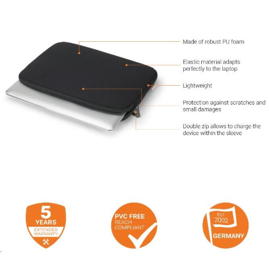 Product Description The Sleeve is made of robust PU foam which perfectly adapts to the form of your notebook like a second skin. The best guaranty against surface scratches and other dents and damages. The design is not only robust, but also extremely light. Your notebook can thus be transported flexibly without taking up a lot of space in your bag. The Sleeve is equipped with two zippers. This allows you to charge your notebook or Ultrabook conveniently, without taking it out of the Sleeve. Another advantage: The zipper is fitted with an extra surface on the inside in order to avoid scratches on the notebook. Made of robust PU foam The elastic material adapts perfectly to the laptop Offers reliable protection against scratches and small damages Double zip allows to charge the device within the sleeve Picture may differ slightly from the original Additional Information Product Dimensions 395 x 280 x 25 mm EAN 7640186417402 Material Jersey fabric with PU foam Colour camel brown Protects your notebook perfectly from scratches and small damages. Art. No. D31975 Weight 0.11 kg Screen size 15 – 15.6” Notebook size ? 385 x 265 x 30 mm; ? 15.6 x 10.43 x 1.18 inches Warranty 5 years extended warranty.