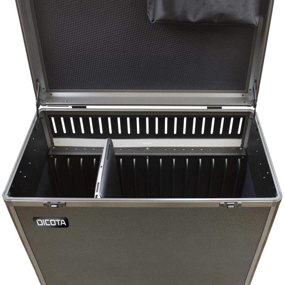 The trolley makes it possible to charge 14 laptops at once, so you remain flexible at all times and don't have to worry about there being no sockets. An adjustable divider allows for the device module to be adapted to notebooks measuring up to 33 × 254 × 380 mm (16 inches) in size. The devices are placed between ABS panels and each given their own place. All power is supplied completely on a removable mounting plate which has its own internal power distribution, is mutually compatible with the GST18 connector, and features a C14 power entry module with an integrated switch and automatically resettable fuse. To protect the devices from overheating, the trolley features a powerful yet quiet fan. Maximum protection is provided by the rugged aluminium and con-pearl construction with built-in lock, the sliding handle, and four high-quality castors for convenient transport. Small items such as power cords can be stored in the pocket on the lid. The charging case comes equipped with country-specific connector strips (internal power distribution, mutually compatible with GST18).