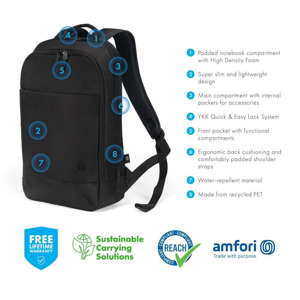 The Eco Backpack Slim MOTION offers ideal protection for laptops between 13 and 15.6" thanks to its high-density foam (HDF) padding. Additional zipped compartment for documents and diaries. The front pocket has practical smaller compartments so you can organize smaller items like your smartphone, pens or chargers. The backpack's ergonomic padding makes it comfortable to wear on your back and the padded shoulder straps can also be adjusted for further comfort. The bag is made of water-repellent material to protect the contents even on rainy days. The Eco Backpack Slim MOTION is therefore perfect for you if you are always on the go and want to support the recycling of PET bottles with an eco-friendly bag.