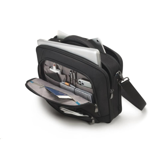 Hrajte bezpečně s Eco Multi PRO! Brašna ve tvaru škeble vás spolehlivě doprovodí všude a splňuje nejvyšší standardy kvality, funkčnosti a ochrany. Systém Fitall s integrovaným popruhem pro uchopení a polstrovanými oddělovači upevní váš 11-14,1" notebook a bezpečně jej dopraví na místo určení. Uzavíratelná kapsa na notebook, polstrování z pěny s vysokou hustotou (HDF) a rám vyztužený kovem zajišťují všestrannou ochranu. Polstrovaná přihrádka pro tablet do velikosti 12,9" chrání před nárazy a je uvnitř vybavena extra měkkým Nylexem. Velkorysý úložný prostor pro vaše dokumenty a mobilní příslušenství. Dvě další přihrádky na dokumenty v zadní části. Přední kapsa s klíčenkou a vkládacími kapsami umožňuje uspořádat osobní vybavení. Dlouhodobé pohodlí při nošení díky pohodlným a nýtovaným rukojetím, nastavitelnému polstrovanému ramennímu popruhu a praktickému popruhu pro upevnění na vozík. Kufr Eco Multi PRO je tedy ideální pro vás, pokud jste stále na cestách a chcete podpořit recyklaci PET lahví ekologickým kufrem.