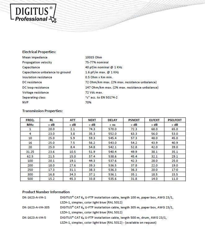 DIGITUS CAT 6A U-FTP Kabel 4x2,drát AWG23, LSOH, modrý, 305m - 4x2 AWG23 drát, čístá měď - Kategorie CAT6A vyhovuje normě ISO/IEC 11801, TIA/-586-C.2, EN 50173 - Nejvyšší podporovaný protokol: 1000BaseT, Gigabit Ethernet - 500MHz - Barevně odlišené žíly - Páry jsou jednotlivě stíněny hliníkovou folií - Celek je nestíněný - Izolace: SFS-PE - Plášť: LSOH - NVP: 70% - Zatížení: 150N max. - Dynamický radius v ohybu: 8x AD mm min. - Static bending radius: 4x AD mm min. - Skladovací teplota: -20°C až 60°C - Teplota při instalaci: 0°C až 50°C - Barva pláště: světle modrá - Délka kabelu v balení:305m na dřevěné cívce Instalační kabel CAT6A zaručuje dlouhou životnost, maximální výkon a bezproblémový chod počítačové sítě. Instalační kabel - CAT6A je určený pro horizontální rozvody a bez problémů splňuje požadavky definované v mezinárodních standardech ISO/IEC 11801, TIA/-586-C.2, EN 50173 pro CAT6A a je proto vhodný i pro provoz těch nejnáročnějších protokolů určených pro strukturovanou kabeláž. e proto vhodný i pro provoz těch nejnáročnějších protokolů určených pro strukturovanou kabeláž..
