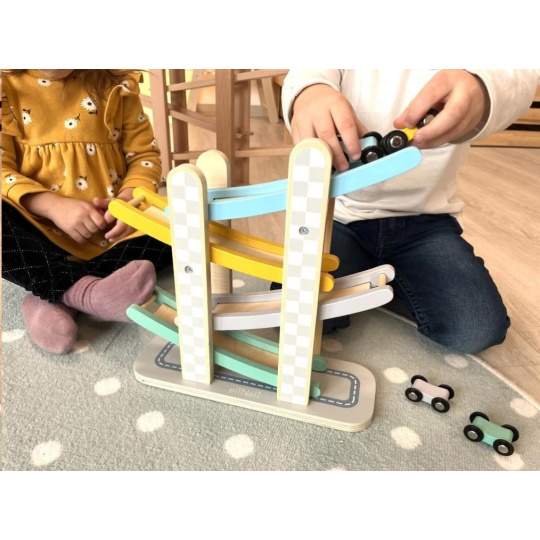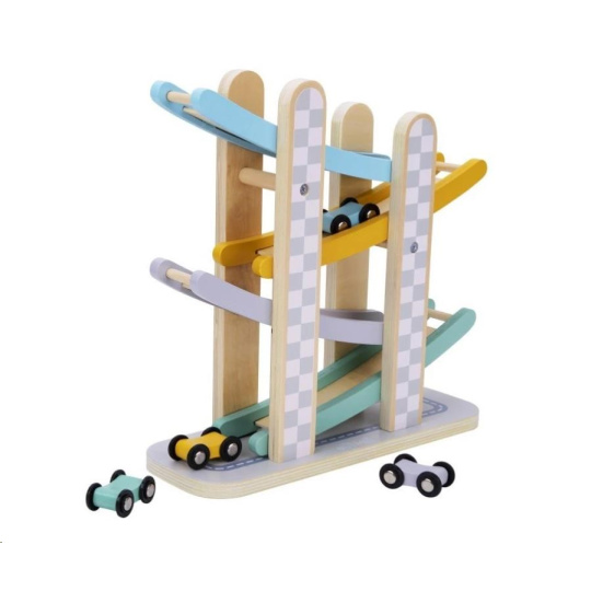 Dřevěná závodní dráha, autodráha se 4 autíčky, probudí duši závodníka v každém dítku. Uspořádání závodů se závodními auty přímo v dětském pokoji je zábavnou hrou pro celou rodinu. Z autíček v krásných pastelových barvách si vybere každý svého favorita. Rozhodující při této hře je správná koordinace, přesnost, chvíle soustředění, zkrátka správně umístit závodničku na nejvyšší patro závodní dráhy.