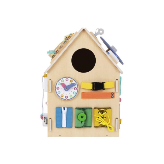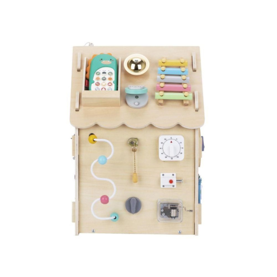 Domeček activity board v přírodním (natur) provedení, s montessori a hracími prvky, s volantem a dalšími zajímavými doplňky láká děti k prozkoumání, ke hře a k učení se. Dřevěný activity board domeček je hračkou i výukovou pomůckou. Při hře děti přirozeným způsobem zdokonalují své dovednosti, učí se novým a užijí si spoustu zábavy..