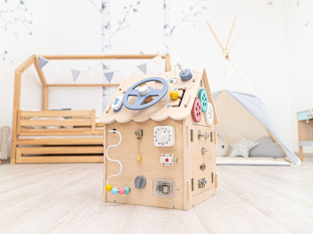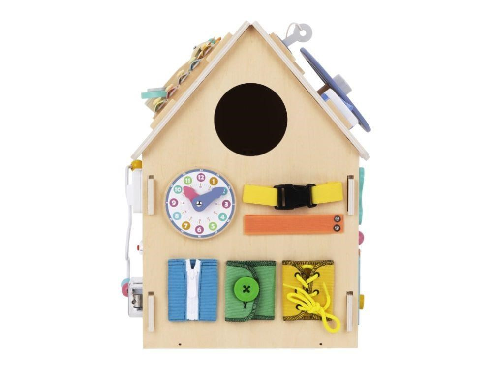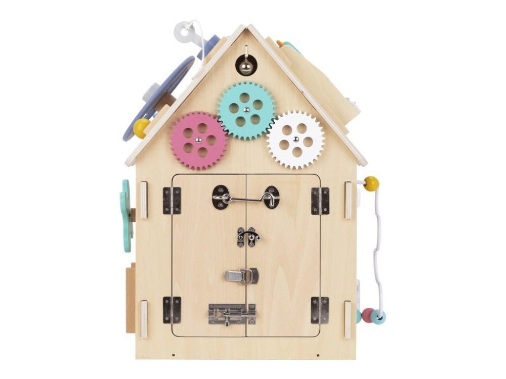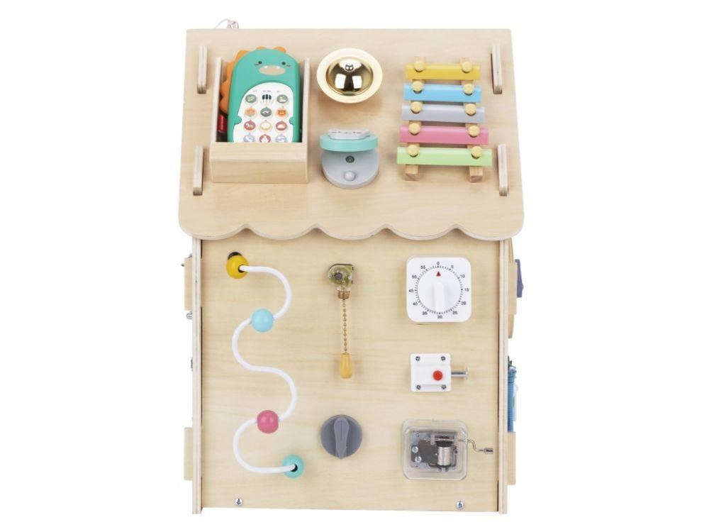 Domeček activity board v přírodním (natur) provedení, s montessori a hracími prvky, s volantem a dalšími zajímavými doplňky láká děti k prozkoumání, ke hře a k učení se. Dřevěný activity board domeček je hračkou i výukovou pomůckou. Při hře děti přirozeným způsobem zdokonalují své dovednosti, učí se novým a užijí si spoustu zábavy..