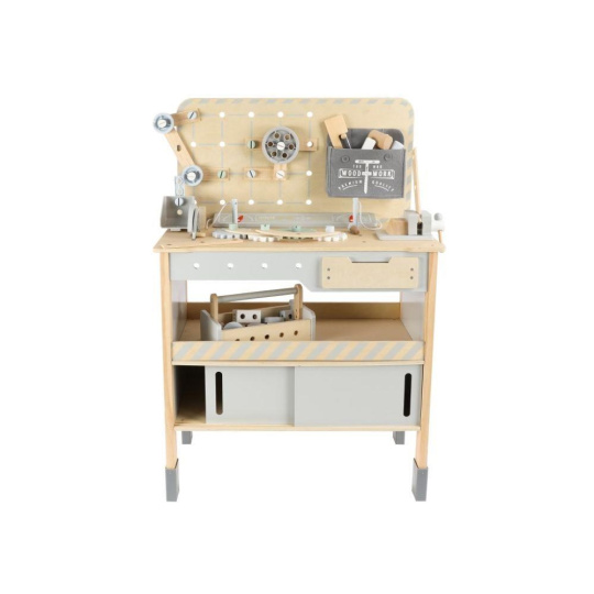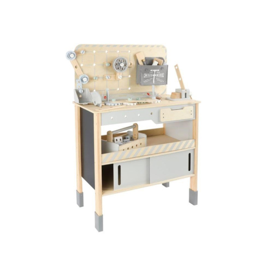 Dětský dřevěný ponk XXL se spoustou příslušenství, parádním jeřábem a opaskem na nářadí ZDARMA nadchne každého malého kutila. Dětský ponk v kombinaci šedé barvy s barvou přírodního dřeva, s jeřábem, nářadím, šrouby, destičkami a hlavně se spoustou vychytávek potrénuje jemnou motoriku, manuální zručnost, koordinaci očí a rukou, rozvíjí kreativitu, učí děti soustředit se a trpělivosti..