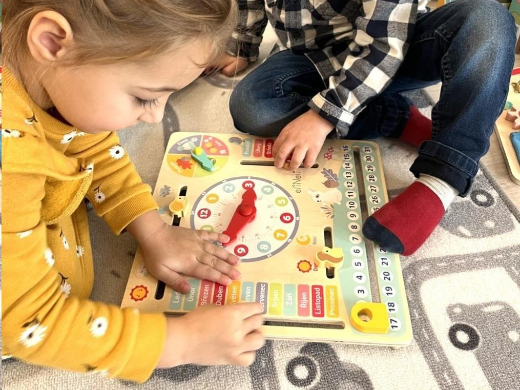 - Hodiny - uprostřed kalendáře najdou děti barevné hodiny s červenými ručičkami, které děti naučí orientovat se v čase.