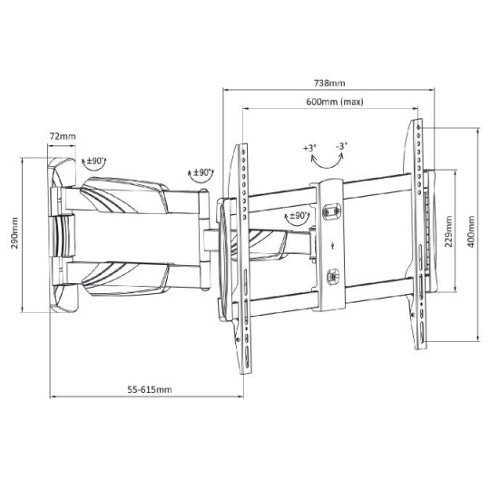 Nástěnný držák pro zavěšení televize 37-70", otočný +/-90°, sklopný +10°/-15°, vzdálenost Tv od zdi 55-615mm, korekce roviny +/-3°, krytky na kabely, VESA 200x100 až 600x400, nosnost 35kg.... více