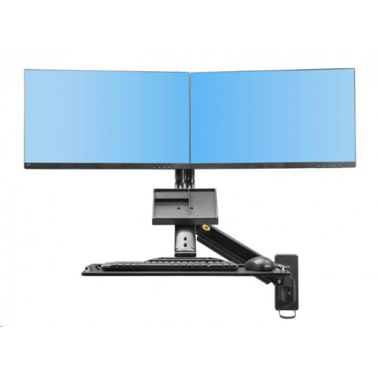 Držák na 2 monitory a klávesnici Fiber Mounts MC27-2AB Profesionální nástěnná pracovní stanice na 2 monitory 17-27" a klávesnici s myší Pracovní stanice s nástěnným držákem na 2 monitory (uchycení vedle sebe) s policí na klávesnici a myš. Kompletní nastavení pozic monitorů i police, plná polohovatelnost - otáčení, naklápění, výškové polohování, odsazení od zdi. Instalace na svislé povrchy (zeď, příčka, sloupek, pilíř, stroje atd.). Nejvyšší kvalita, krásný dizajn, snadná ovladatelnost - profesionální výrobek. Barva černá, záruka 3 roky. Nástěnná pracovní stanice s držákem na 2 monitory a policí na klávesnici a myš, výškové polohování pro práci v sedě i vestoje, otáčení naklápění - Fiber Mounts MC27-2AB Technické údaje: minimální zatížení 6kg (kvůli tuhosti plynového pístu) maximální zatížení 12kg ideální na monitory s úhlopříčkou 17" až 27" nastavení požadované pozice monitorů naklápění +10° až -15° výškové polohování od police 100mm funkce pivot maximální vzdálenost mezi držáky monitorů 670mm polohování ramene držáku otáčení do stran +180°/-180° výškové polohování 480mm nastavení vzdálenosti od zdi 90mm (zaklopená polička) až 1010mm polička na klávesnici s myší rozměry 560mm x 200mm nastavení náklonu police +12°/-12° úprava vzdálenosti police od monitorů až 60mm možnost zaklopení police na klávesnici a myš přihrádka na dokumenty, poznámky,vizitky, zápisník atp. systém vedení kabeláže profesionální zpracování, nejvyšší kvalita barevné provedení černé záruka 3 roky.