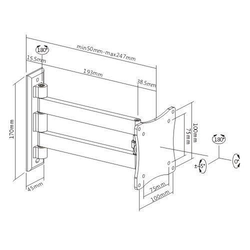 Držák na LCD LED monitory Fiber Mounts FM102G Otočný, sklopný a výsuvný držák na monitor 13-30", nastavení vzdálenosti od zdi 50-247mm, VESA 75x75 a 100x100, lehký, hliníkový, nosnost 15kg Kvalitní, bezpečný a spolehlivý nástěnný držák na LCD LED monitory a televize 13-30", který má hliníkovou, velmi lehkou konstrukci. Držák umožňuje s televizí nebo monitorem otáčet, naklápět a měnit vzdálenosti od zdi. Instalace je velmi snadná, zvládne ji i naprostý laik. Barevné provedení černé, záruka 5 let. Nástěnný lehký hliníkový držák na LCD LED monitory a televize Fiber Mounts FM120G je otočný, sklopný a délkově nastavitelný Technické údaje: maximální zatížení 15 kg podporuje VESA standardy 75x75 a 100x100 vhodný na LCD LED monitory 13-30" nebo menší televize otáčení do stran +/- 90° naklápění +/- 45° minimální vzdálenost od zdi 50 mm maximální vzdálenost od zdi 247 mm kvalitní pevná hliníková konstrukce spolehlivé a bezpečné zavěšení monitoru nebo Tv na stěnu velmi snadná instalace barevné provedení černé záruka 5 let Možnost přisunout monitory na vzdálenost 5cm ke zdi a odsunout až o 24,7cm - držák Fiber Mounts FM102GKvalitní nástěnný držák na LCD LED monitory Fiber Mounts FM102G lze odsunout od zdi na vzdálenost až 247mm Držák monitory a Tv Fiber Mounts FM102G podporuje VESA standardy: VESA 75x75 VESA 100x100 Držák Fiber Mounts FM102G je vhodný na všechny monitory a televize, které podporují VESA 75x75 nebo 100x100 a jejich hmotnost není větší jak 15kg. Na velikosti nezáleží. Držák Fiber Mounts FM102G je vhodný pro zavěšení monitorů a televizí na všechny svislé povrchy, tedy nejen zdi a stěny, ale i na pilíře, sloupky, trámy nebo přepářky u stolů. Velkou výhodou může být opravdu velmi nízká hmotnost díky hliníkové konstrukci, přesto má držák vynikající pevnost a uchycení obrazovek je naprosto bezpečné a spolehlivé..