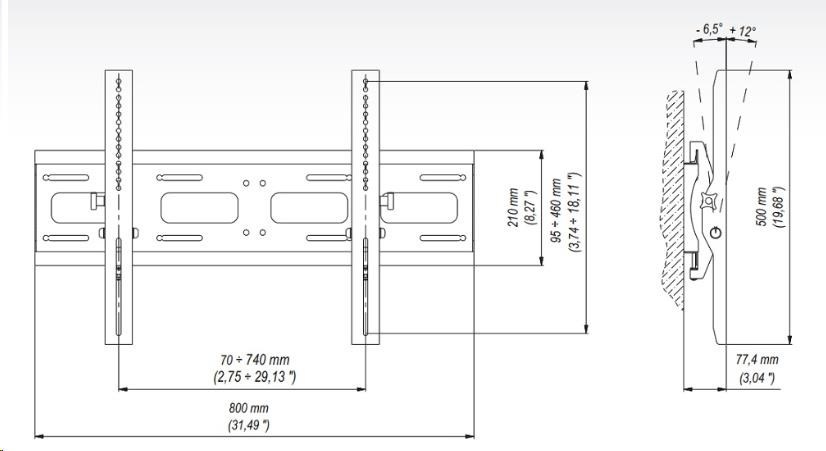 Technické údaje: doporučená velikost TV 42" - 63" nosnost TV držáku 80kg vzdálenost od zdi 77mm náklon Tv +6,5° / -12° VESA standart 100x100 až 740x460mm profesionální konstrukce zajištění TV proti pádu certifikovaný náklopný držák jednoduchá instalace záruka 10 let DRŽÁK PODOPORUJE VESA STANDARDY: VESA 100x100 VESA 200x100 VESA 200x200 VESA 300x200 VESA 300x300 VESA 400x200 VESA 400x300 VESA 400x400 VESA 600x400 všechny atypické rozměry VESA standartů až do rozměrů 700x460mm.