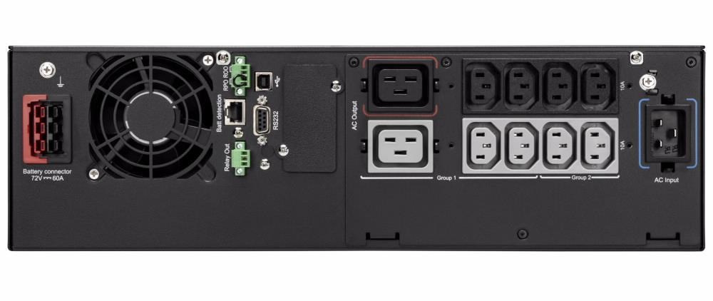 | Komunikace | USB port (kompatibilní s HID) Sériový port (RS232) Mini svorkovnice pro dálkové zapnutí / vypnutí (ROO) a vzdálené vypnutí (RPO) Mini svorkovnice pro výstupní relé Bezpotenciálové kontakty (3 výstupy, 1 vstup, optočlen, DB9) |