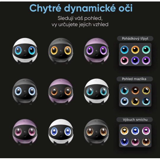 - Chytré dynamické oči – dva displeje s nastavitelnými barvami a animacemi dodávají robotovi osobnost a přátelský vzhled