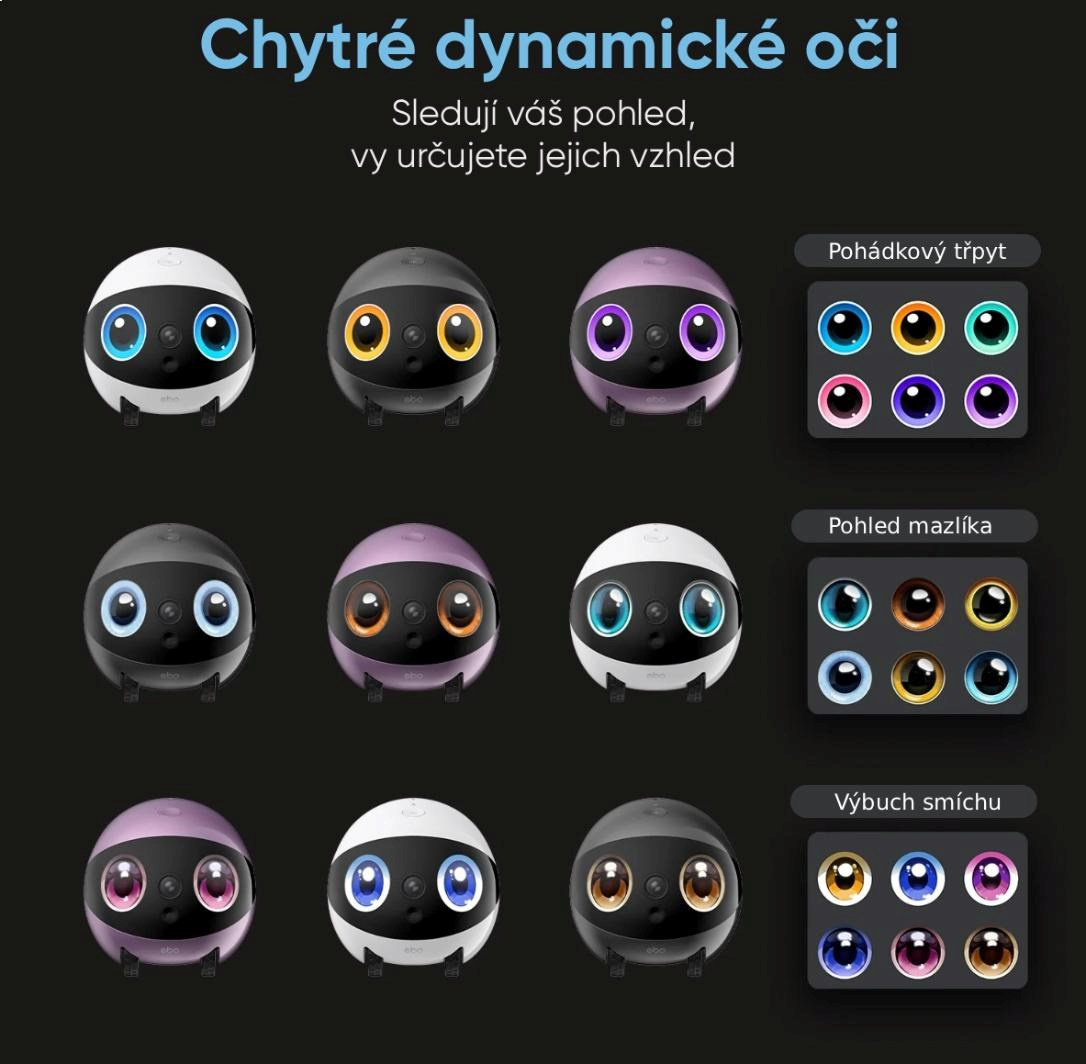 - Chytré dynamické oči – dva displeje s nastavitelnými barvami a animacemi dodávají robotovi osobnost a přátelský vzhled