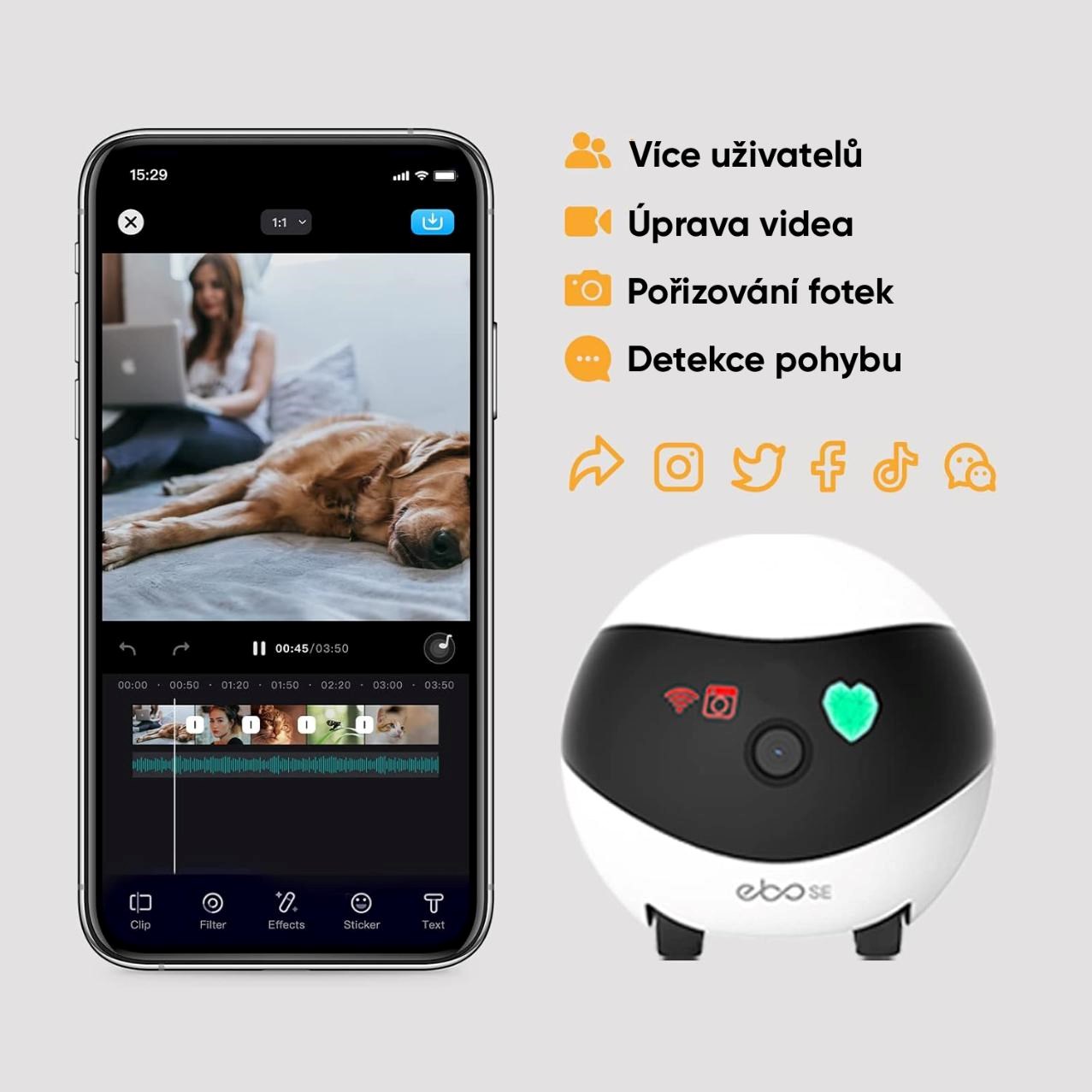 - Zábava pro mazlíčky i děti – EBO SE reaguje na pohyb, lze s ním hrát hry nebo se může stát „společníkem na dálku“.