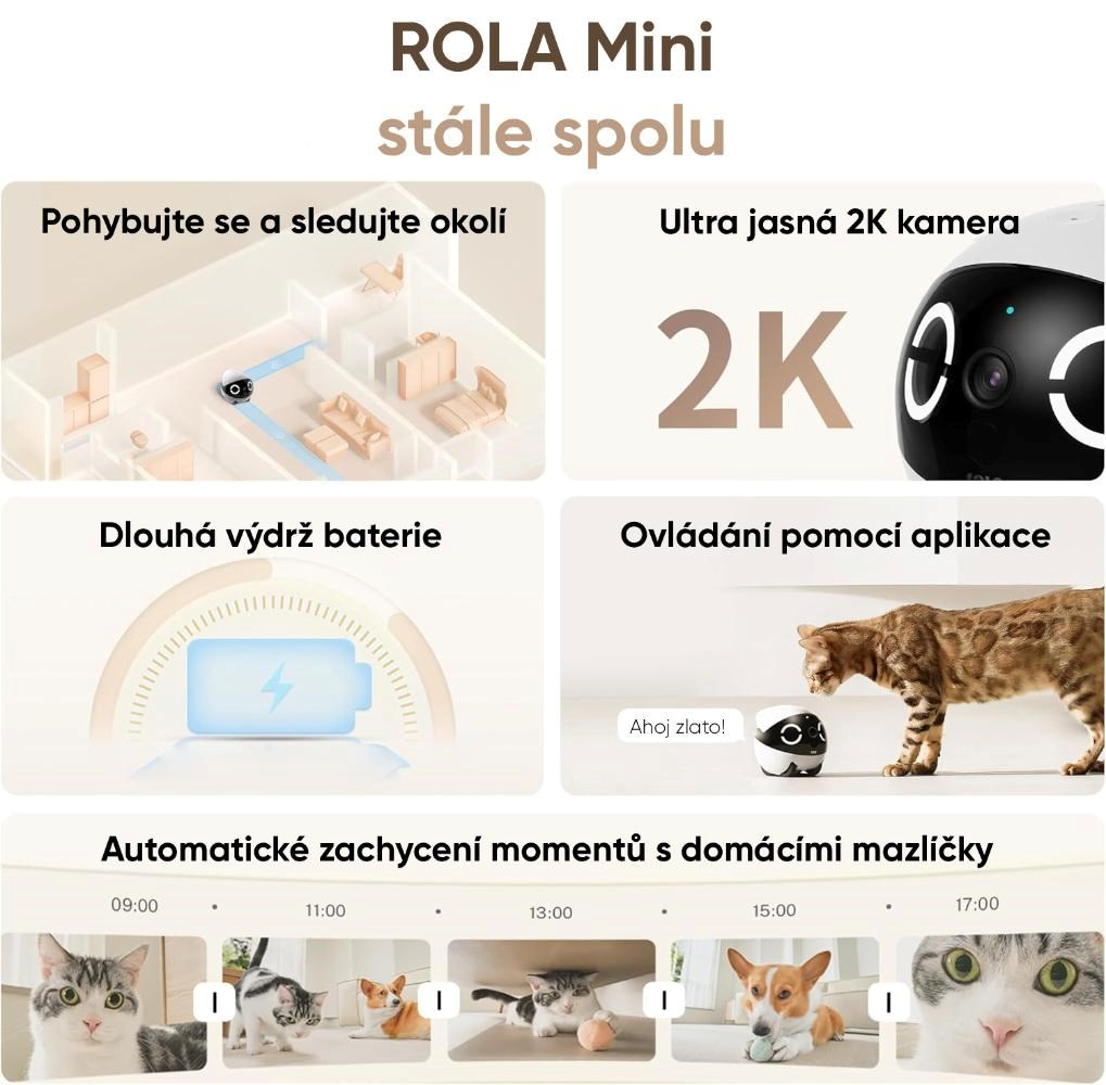 Kamera s rozlišením 2K a širokým zorným úhlem 137° zachytí každý důležitý moment, zatímco obousměrný zvuk umožní mluvit se zvířetem nebo třeba s dětmi doma. ROLA Mini zvládá i vzdálené videohovory – stačí jediné klepnutí v aplikaci a můžete se spojit s kýmkoli, kdo má robota připojeného. Díky vysokokapacitní baterii 5000 mAh robot funguje zcela samostatně, až 25 dní. Jeho odolná konstrukce a pohyblivost zaručují, že zvládne i hravé nárazy nebo nečekané překážky.