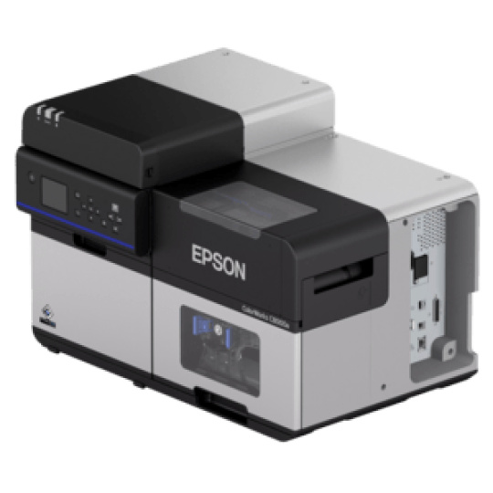 colour label printer, ink-jet, resolution: 47 dots/mm (1200 dpi), media width (max.): 112 mm, print width (max.): 108 mm, speed (max.): 300 mm/s, cutter, display, USB (3.0), Ethernet, incl.: cable (USB), power supply unit, Label roll, ink cartridge, QSG, order separately: power cable, colour: black, grey.