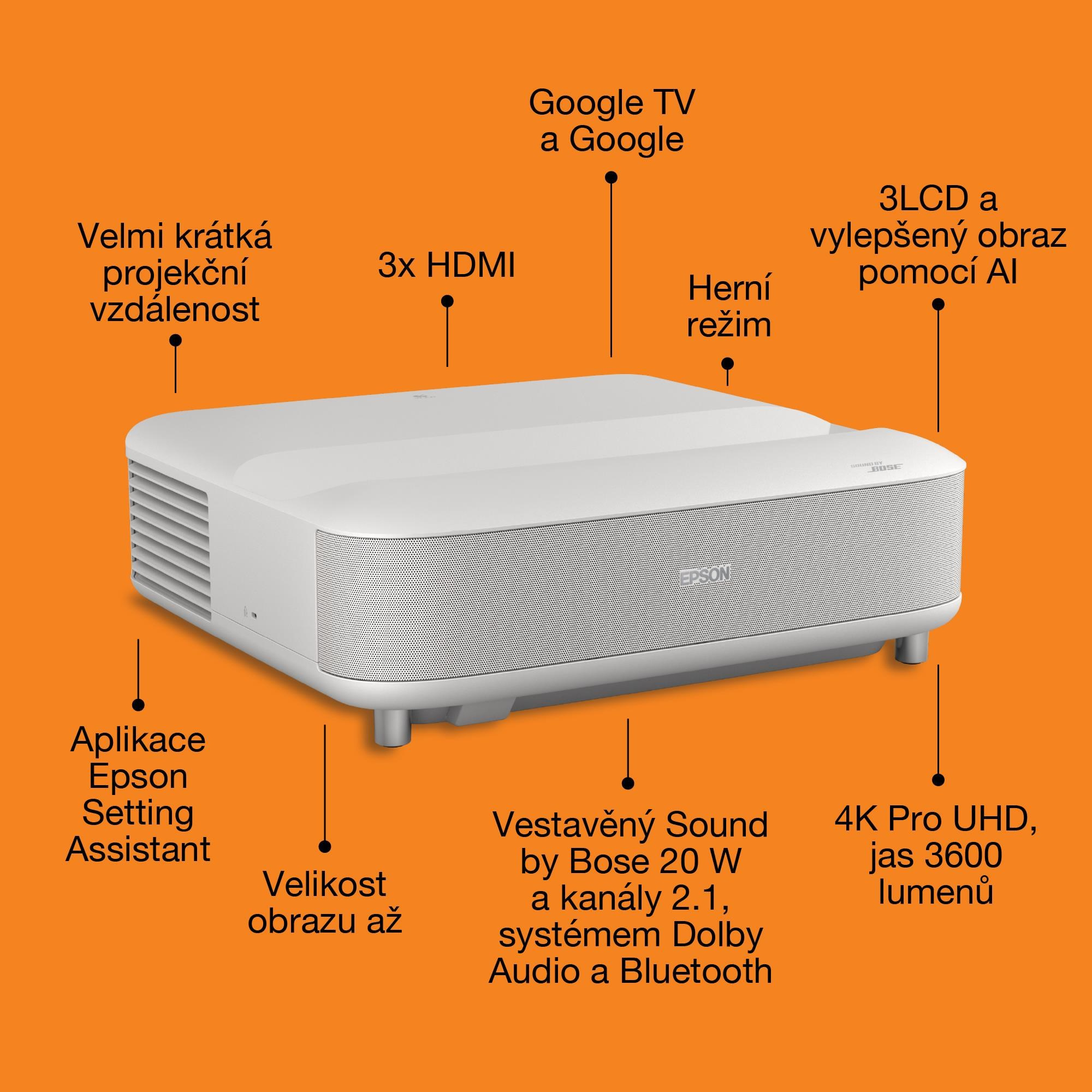 Použití projektoru: Domácí kino / hraní her / streamování / televize a set-top boxy; Typ projekce: Ultra Short Throw (UST); Skutečné rozlišení projektoru: 4K PRO-UHD (3840 × 2160); Projekční poměr: 16:9; Projekční vzdálenost (min) (m): 0,3; Projekční vzdálenost (max) (m): 0,7; Úhlopříčka obrazu (max) ("): 120; Technologie: 3LCD (RGB se závěrkou s kapalnými krystaly C2 Fine); Zdroj světla: Laser (životnost až 20 000 h); Kontrast (hodnota : 1): 5 000 000; Jas (ANSI lumenů): 3 600; Zvuk: Sound by Bose + Dolby Audio + Bluetooth (20 W 2.1kanálový systém); Smart funkce: Google TV, Google Assistant, Chromecast, režim ALLM.... více