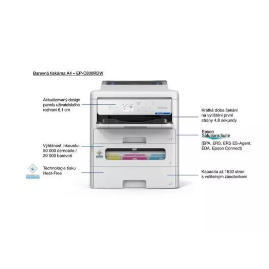 Inkoustová tiskárna EP-C800RDW RIPS nabízí řešení pro efektivní, nepřerušovaný velkoobjemový tisk bez nutnosti výměny spotřebního materiálu. Díky bezproblémové integraci (do řešení třetích stran), malému půdorysu a nízkým celkovým nákladům na vlastnictví (TCO) je ideální pro menší podniky. Nízká spotřeba energie1, rychlý výstup první strany (FPOT)2, rychlost tisku 25 str./min3, to vše skvěle vyhovuje kancelářskému prostředí..