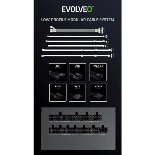 Zapomeňte na zamotané kabely, které brání proudění vzduchu a ještě vaší počítačové skříni kazí styl. Zdroj EVOLVEO G1000 je plně modulární, takže k němu připojíte jen ty kabely, které opravdu potřebujete. Součástí balení jsou všechny důležité šňůry – jeden kabel ATX 24 PIN, dva EPS 4+4 PIN, dva PCI-E 6+2 PIN, jeden PCI-E 5.1 12V-2×6, tři SATA a jeden MOLEX. Díky tomu máte místo na vše od CPU a GPU přes disky až po vymazlené LED pásky či jiné extra prvky.