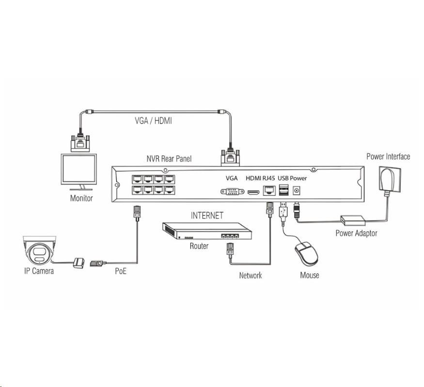 | Obsah balení | NVR jednotka s 8x LAN/POE vstupem, SATA připojením pro až 8TB disk 4x POE Bullet IP66 kamera s nočním přísvitem 1x napájecí adaptér DC 48V 2A 4x sada pro upevnění kamery 4x bajonetová těsnící krytka pro RJ45 konektor 1xUSB myš 1xSATA kabel pro připojení HDD 1x Uživatelský manuál |