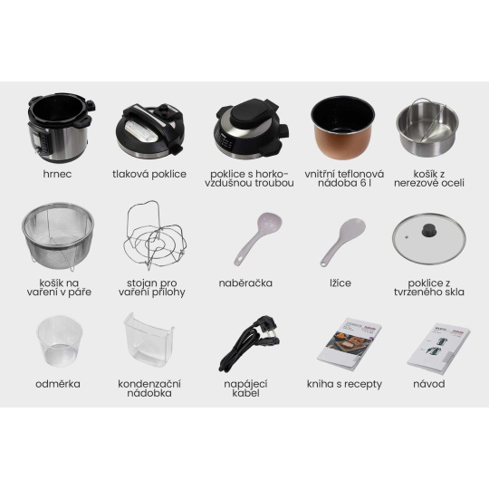 Horkovzdušná trouba, která je součástí balení, peče shora. Díky hornímu ohřevu dokážete připravit například menší kuře s křupavou kůžičkou, hranolky nebo koláč. Horkovzdušnou troubu můžete použít i jako doplněk po takovém vaření třeba jen k zapečení jídla.
