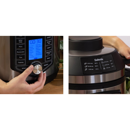 Ovládací panel hrnce i horkovzdušné trouby jsou v českém jazyce a jsou jednoduché a intuitivní. Mimo nadefinované programy je možné použit vlastní nastavení pro tlak a čas přípravy jídla. U horkovzdušné trouby je možné nastavit i teplotu.