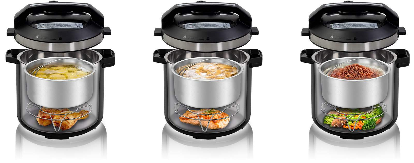 Režimy vaření se liší podle použití jednotlivých pokliček a programů. Balení multifunkčního hrnce Salente Ario II obsahuje tři poklice: horkovzdušnou troubu, poklici pro tlakové vaření a skleněnou poklici pro restování.