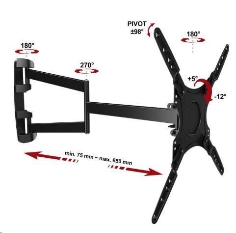 Nástěnný držák Tv s nastavitelnou délkou 7,5 až 85cm, otočný do stran, sklopný, nosnost 30kg, VESA 75x75 až 400x400.... více