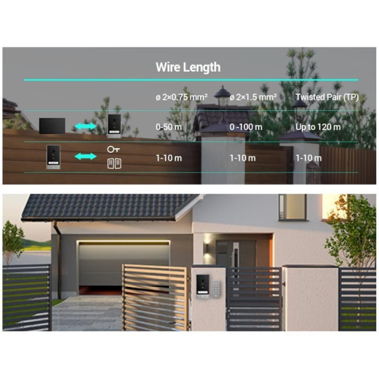 Otevření brány (Gate): Podpora pro 2 vývody. Vzdálenost 1-10m. Panel interkomu poskytuje suchý kontakt, bez elektrického proudu, pro připojení k tlačítku pro automatizovanou bránu, kapacita přerušení brány: 12V/2A