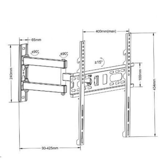 Technické údaje: nosnost 30kg podporuje VESA standardy 100x100 až 400x400 na všechny typy televizorů s úhlopříčkou 26-55" otáčení na obě strany +/- 90° náklon obrazovky nahoru nebo dolů +/- 15° nastavení vzdálenosti od zdi v rozmezí 90-425mm zajištění obrazovky proti vysazení kvalitní ocelová konstrukce ukotvení do zdi na 3 hmoždinky instalační materiál součástí balení barevné provedení černé výborná kvalita záruka 3 roky Kloubový držák na Tv FM761 podporuje VESA standardy: VESA 100x100 VESA 200x100 a 100x200 VESA 200x200 VESA 300x200 a 200x300 VESA 300x300 VESA 400x200 a 200x400 VESA 400x300 a 300x400 VESA 400x400 Držák nepodporuje VESA standard 75x75, který bývá u nejmenších televizorů a monitorů. Nástěnný držák FM761 je vhodný pro zavěšení všech typů televizorů a monitorů, které podporují některý z výše uvedených VESA standardů a jejichž hmotnost není vyšší jak 30kg. Zavěsit můžete jak klasické rovné tak i prohnuté televizory a monitory. Na úhlopříčce televizoru nebo monitoru nezáleží, pokud není překročena nosnost držáku a Vaše Tv podporuje některý z uvedených VESA standardů, můžete zavěsit i podstatně větší obrazovky..