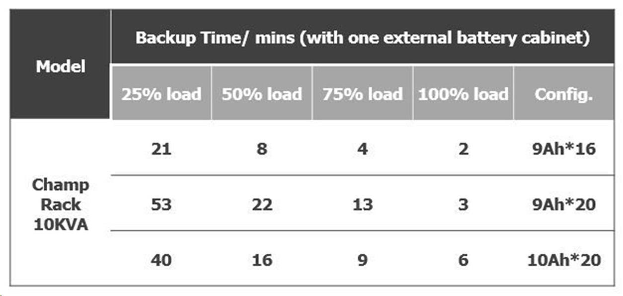 Backup time - 1x Battery Bank (20pcs 10Ah)