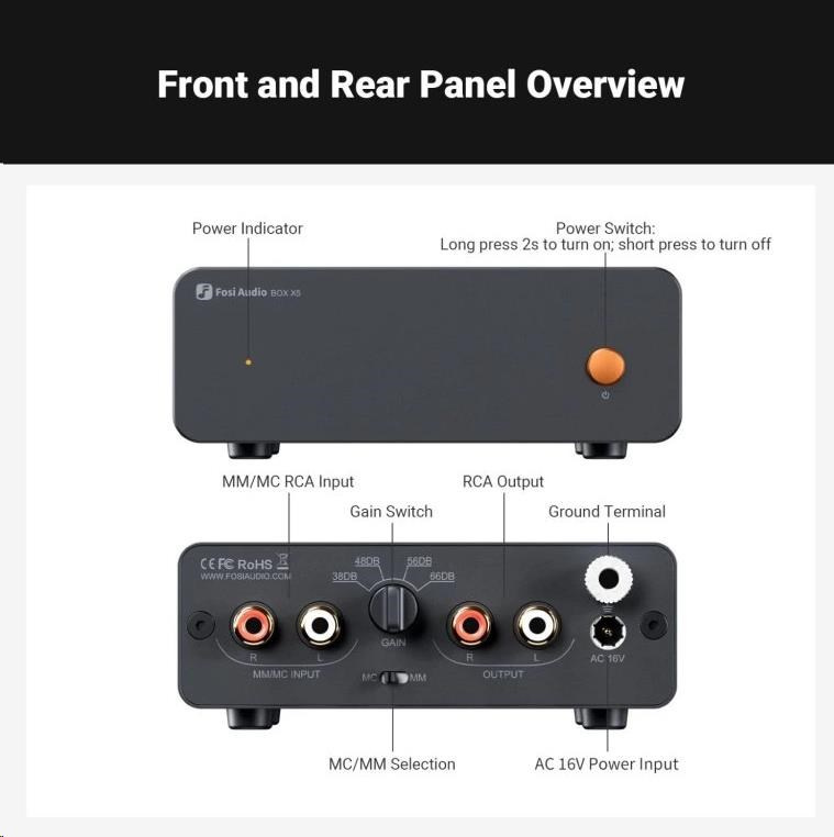 Fosi Audio BOX X5 je phono předzesilovač navržený pro gramofony s přenoskami typu MM i MC. Dokáže převést slabý signál z gramofonu na úroveň použitelné linkové úrovně, čímž umožní připojení k běžným zesilovačům, aktivním reproduktorům nebo HiFi systémům bez vestavěného phono vstupu. Díky precizní RIAA korekci přináší vinylovým deskám bohatý, čistý a dynamický zvuk.