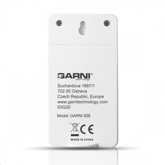 Bezdrátové čidlo pro měření teploty, určeno pro meteorologickou stanici GARNI 365 Arcus vlhkosti odolné, krytí IPX4 (odolné proti stříkající vodě) displej o rozměrech 19 x 11 mm velikost číslic na displeji: teplota 6,5 mm měření teploty 3 kanály maximální RF výkon 10 dBm (10 mW) možnost postavení a zavěšení barva bílá.