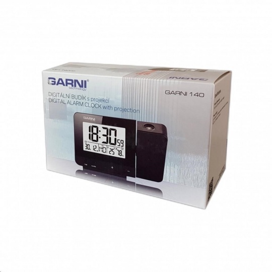 Digitální budík s projekcí času a vnitřní teploty s LCD displejem, časem řízeným rádiovým signálem DCF-77 a měřením vnitřní teploty a relativní vlhkosti LCD displej o rozměrech 63 x 42 mm s možností stálého osvětlení při napájení síťovým adaptérem, nebo krátkodobým osvětlením na 8 s při napájení bateriemi 3 stupně jasu osvětlení displeje, možnost vypnutí osvětlení displeje (při napájení síťovým adaptérem) velikost číslic na displeji – čas 25 mm, datum, zkratka názvu dne, vnitřní teplota a rel. vlhkost 8,5 mm čas a datum řízené signálem DCF-77 s možností manuálního nastavení ikona příjmu signálu DCF-77 zkratka názvu dne 12ti, nebo 24 hodinový formát zobrazení času možnost nastavení časového pásma od -12 do +12 hodin budík s 2 budícími časy s funkcí opakovaného buzení (Snooze) po 5 minutách budící signál - 10 sekund 1 pípnutí za sekundu, 10 sekund 2 pípnutí za sekundu, 10 sekund 4 pípnutí za sekundu a poté stálé pípání projekce času a vnitřní teploty s možností otočení obrazu o 180°, možnost sklopení tubusu projektoru o 90° dopředu a dozadu barva projekce červená stálá projekce při napájení síťovým adaptérem s možností vypnutí zobrazení hodnot vnitřní teploty a relativní vlhkosti zobrazení teploty ve °C, nebo °F USB port pro nabíjení mobilních zařízení (pouze při napájení hlavní jednotky síťovým adaptérem), maximální nabíjecí proud 1 000 mA napájení síťovým adaptérem, nebo bateriemi možnost postavení barva černá Obsah balení: 1 x digitální budík GARNI 140 1 x síťový adaptér český, slovenský, německý, anglický, italský, polský a maďarský návod.