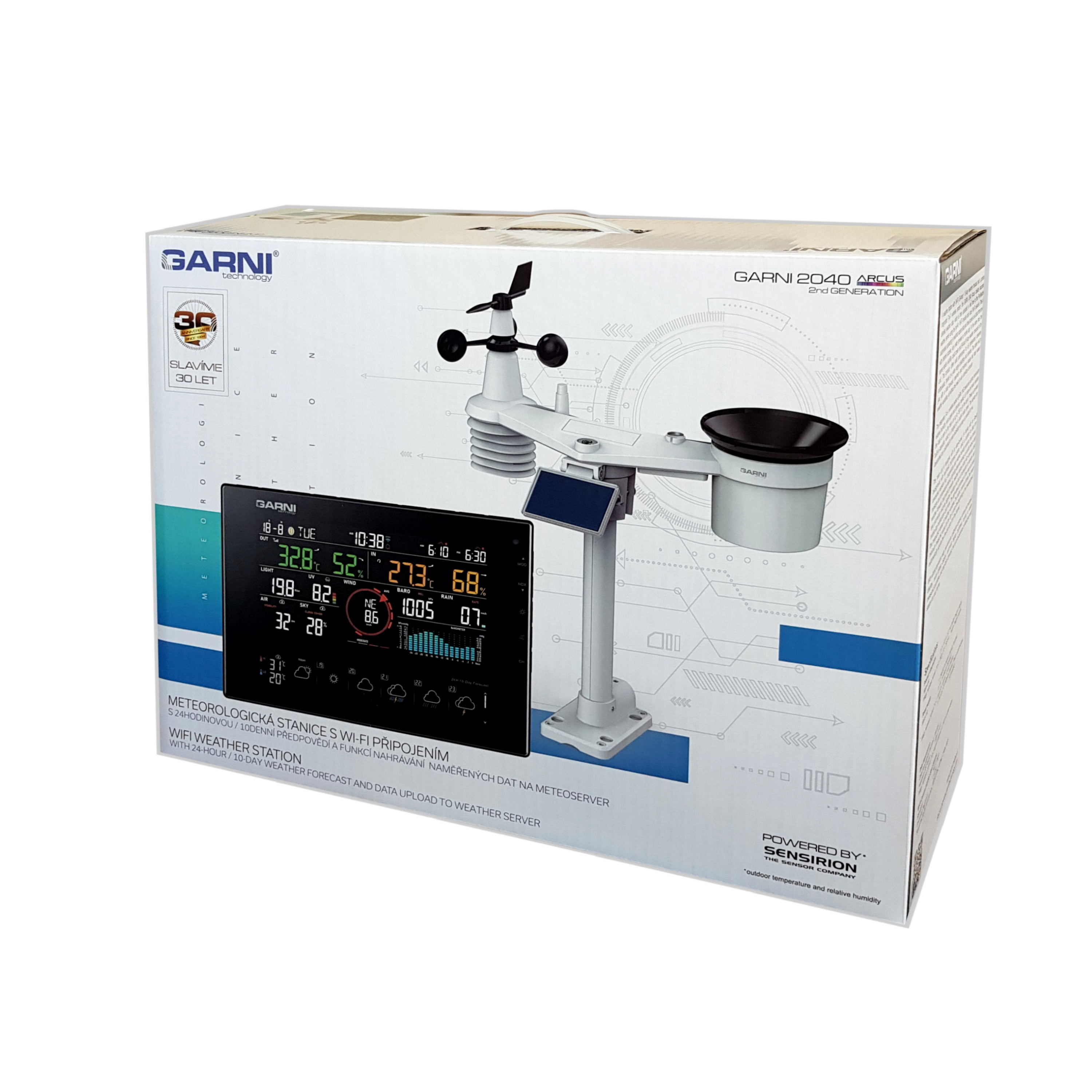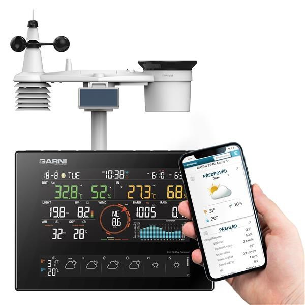Meteorologická stanice s Wi-Fi, 24hodinovou (předpověď po hodině) / 10denní předpovědí a profesionálním integrovaným bezdrátovým čidlem 7-v-1 se solárním panelem a vestavěným kapacitorem, model GARNI 2040 Arcus 2GEN, shromažďuje přesné a podrobné údaje o počasí, které následně v reálném čase nahrává pomocí vestavěného modulu Wi-Fi a místní Wi-Fi sítě na meteorologický server ProWeatherLive. Ten umožňuje automatizované nahrávání údajů z meteorologické stanice a volný přístup ke všem údajům odkudkoliv, kde je přístup k internetu, a to prostřednictvím webového prohlížeče nebo mobilní aplikace. Současně server PWL odesílá do hlavní jednotky informace o dohlednosti, oblačnosti a 24hodinové / 10denní předpovědi počasí. Výrobek nabízí solidní výkon všem profesionálním pozorovatelům a nadšencům, a to díky široké škále nastavení a čidel. Stanice vám poskytne místní předpověď, maximální a minimální hodnoty a celkové hodnoty všech meteorologických veličin, to vše, aniž byste museli použít stolní počítač.