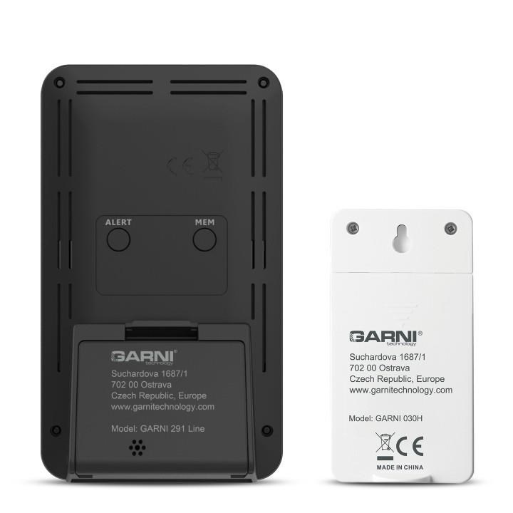 Meteorologická stanice se špičkovým inverzním barevným VA displejem s časem řízeným rádiovým signálem DCF-77, budíkem, měřením vnitřní teploty, relativní vlhkosti a absolutního barometrického tlaku a bezdrátovým čidlem pro měření vnější teploty a relativní vlhkosti inverzní barevný VA displej o rozměrech 64 x 94 mm s možností stálého osvětlení při napájení síťovým adaptérem, nebo krátkodobým osvětlením na 15 s při napájení bateriemi 4 stupně jasu osvětlení displeje, možnost vypnutí osvětlení displeje s možností krátkodobého osvětlení na 15 s (při napájení síťovým adaptérem) funkce automatického ztlumení osvětlení displeje v nastavený časový interval velikost číslic na displeji – čas 12 mm, datum 5,5 mm, zkratka názvu dne 6 mm, barometrický tlak 8 mm, vnitřní a vnější teplota a rel. vlhkost 13 mm čas a datum řízené signálem DCF-77 s možností manuálního nastavení ikona příjmu signálu DCF-77 zkratka názvu dne v češtině, angličtině, němčině, francouzštině, italštině, španělštině, portugalštině, nizozemštině, dánštině, norštině, švédštině, polštině, finštině, maďarštině a ruštině 12ti, nebo 24 hodinový formát zobrazení času možnost nastavení časového pásma od -12 do +12 hodin 2 budíky, možnost nastavení buzení každý den, v pracovní dny, nebo pouze o víkendu funkce opakovaného buzení (Snooze) po 5 minutách budící signál - 10 sekund 1 pípnutí za sekundu, 10 sekund 2 pípnutí za sekundu, 10 sekund 3 pípnutí za sekundu a poté stálé 4 pípnutí za sekundu 5 ikon předpovědi počasí (slunečno, polojasno, oblačno, srážky a sněžení) na základě sledování barometrického tlaku vestavěným barometrickým čidlem zobrazení hodnot vnitřní a vnější teploty a relativní vlhkosti paměť na maximální a minimální naměřené hodnoty teploty a rel. vlhkosti měření absolutního barometrického tlaku (hPa / mb nebo inHg) šipky tendence vývoje absolutního barometrického tlaku, vnitřní a vnější teploty a rel. vlhkosti sloupcový graf vývoje barometrického tlaku za uplynulých 24 hodin. 3 ikony stavu vnitřní a venkovní relativní vlhkosti možnost nastavení alarmu horní meze venkovní teploty v rozsahu od -39°C do +70°C a dolní meze venkovní teploty v rozsahu od -40°C do +69°C (akustickým signálem a ikonou na displeji) pro každý kanál zvlášť indikace námrazy ikonou na displeji, pokud bude naměřena venkovní teplota rozsahu od -1°C do +3°C některým z přihlášených bezdrátových čidel zobrazení teploty ve °C, nebo °F možnost použití až 3 bezdrátových čidel GARNI 30H (jedno čidlo GARNI 030H je součástí dodávky) funkce automatického přepínání kanálů bezdrátový přenos hodnot vnější teploty a relativní vlhkosti na frekvenci 433,92 MHz ikona příjmu signálu bezdrátového čidla ikony slabých baterií napájení síťovým adaptérem nebo bateriemi možnost postavení barva černá Bezdrátové čidlo GARNI 030H vlhkosti odolné displej o rozměrech 19 x 11 mm velikost číslic na displeji: teplota a relativní vlhkost 4 mm měření teploty a relativní vlhkosti 3 kanály maximální RF výkon 10 dBm (10 mW) možnost postavení a zavěšení barva bílá Obsah balení: 1 x hlavní jednotka GARNI 291 Line 1 x bezdrátové čidlo GARNI 030H 1 x síťový adaptér český, slovenský, německý, anglický, nizozemský, polský a maďarský návod.