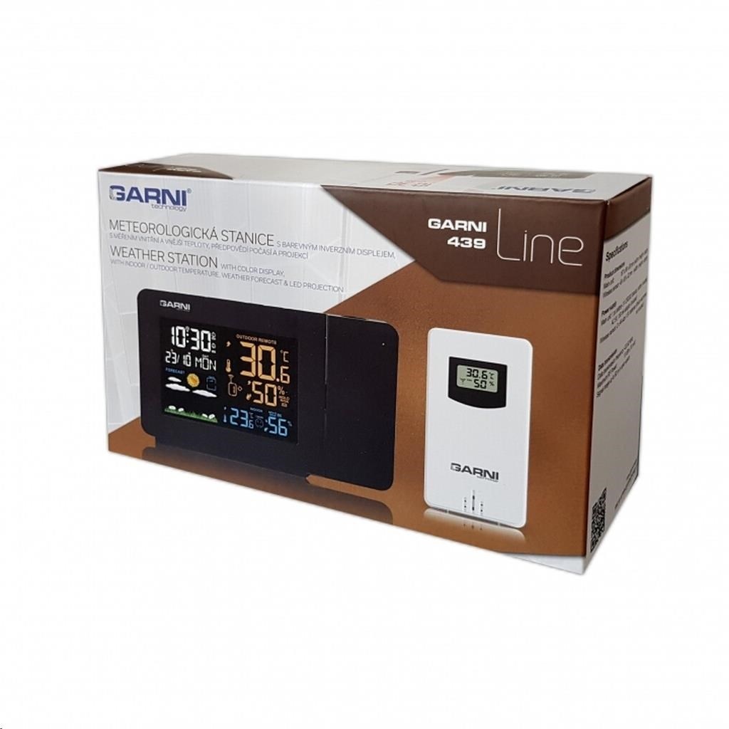 Meteorologická stanice se špičkovým inverzním barevným VA displejem s časem řízeným rádiovým signálem DCF-77, budíkem, měřením vnitřní teploty a relativní vlhkosti, bezdrátovým čidlem pro měření vnější teploty a relativní vlhkosti a projekcí času a vnitřní / venkovní teploty inverzní barevný VA displej o rozměrech 94 x 63 mm s možností stálého osvětlení 3 stupně jasu osvětlení displeje, možnost vypnutí osvětlení displeje s možností krátkodobého osvětlení na 15 s velikost číslic na displeji – čas 13 mm, datum, zkratka názvu dne 7 mm, vnitřní teplota a relativní vlhkost 10 mm, vnější teplota 20,5 mm, vnější relativní vlhkost 13 mm čas a datum řízené signálem DCF-77 s možností manuálního nastavení ikona příjmu signálu DCF-77 zkratka názvu dne 12ti, nebo 24 hodinový formát zobrazení času možnost nastavení časového pásma od -12 do +12 hodin budík s 2 budícími časy s funkcí opakovaného buzení (Snooze) nastavitelné od 5 do 60 minut budící signál - 10 sekund 1 pípnutí za sekundu, 10 sekund 2 pípnutí za sekundu, 10 sekund 3 pípnutí za sekundu a poté stále 4 pípnutí za sekundu střídavá projekce času a vnitřní a vnější teploty (teploty se střídají co 5 s) s možností otočení obrazu o 180°, možnost sklopení tubusu projektoru o 90° dopředu a dozadu barva projekce červená 2 stupně jasu a možnost vypnutí projekce 6 animovaných ikon předpovědi počasí (slunečno, polojasno, oblačno, srážky, silný déšť a sněžení) na základě sledování barometrického tlaku vestavěným barometrickým čidlem možnost nastavení výchozí ikony předpovědi počasí zobrazení hodnot vnitřní a vnější teploty a relativní vlhkosti paměť na maximální a minimální naměřené hodnoty teploty a rel. vlhkosti s automatickým mazáním v 0:00 hodin šipky tendence vývoje barometrického tlaku, vnitřní a vnější teploty a rel. vlhkosti 3 stupně indikace stavu vnitřní a vnější relativní vlhkosti indikace námrazy vnější teploty v rozsahu od -1°C do +3°C ikonou na displeji zobrazení teploty ve °C, nebo °F zobrazení hodnoty venkovního rosného bodu a teplotního indexu pro každý kanál možnost použití až 3 bezdrátových čidel GARNI 30H (jedno čidlo GARNI 030H je součástí dodávky) funkce automatického přepínání kanálů 5 ikon vnitřní tepelné pohody bezdrátový přenos hodnot vnější teploty a relativní vlhkosti na frekvenci 433 MHz ikona příjmu signálu bezdrátového čidla ikony slabých baterií napájení síťovým adaptérem a záložními bateriemi možnost postavení barva černá Bezdrátové čidlo GARNI 030H vlhkosti odolné displej o rozměrech 19 x 11 mm velikost číslic na displeji: teplota a relativní vlhkost 4 mm měření teploty a relativní vlhkosti 3 kanály maximální RF výkon 10 dBm (10 mW) možnost postavení a zavěšení barva bílá Obsah balení: 1 x hlavní jednotka GARNI 439 Line 1 x bezdrátové čidlo GARNI 030H 1 x síťový adaptér český, slovenský, německý, anglický, italský, polský a maďarský návod.