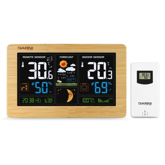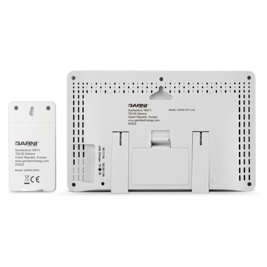 ? inverzní barevný VA displej o rozměrech 167 x 93 mm s možností stálého osvětlení při napájení síťovým adaptérem, nebo krátkodobým osvětlením na 15 s při napájení bateriemi ? ? velikost číslic na displeji – čas, datum, barometrický tlak 8 mm, zkratka názvu dne 6 mm, vnitřní a vnější teplota 30 mm, vnitřní a vnější relativní vlhkost 20 mm ? čas a datum řízené signálem DCF-77 s možností manuálního nastavení ? ikona příjmu signálu DCF-77 ? zkratka názvu dne ? 12ti, nebo 24 hodinový formát zobrazení času ? možnost nastavení časového pásma od -12 do +12 hodin ? ? budící signál - 10 sekund 1 pípnutí za sekundu, 10 sekund 2 pípnutí za sekundu, 10 sekund 4 pípnutí za sekundu a poté stále 8 pípnutí za sekundu ? 6 animovaných ikon předpovědi počasí (slunečno, polojasno, oblačno, srážky, silný déšť a sněžení) na základě sledování barometrického tlaku vestavěným barometrickým čidlem ? ? ? měření absolutního barometrického tlaku (mb / hPa nebo inHg) ? šipky tendence vývoje absolutního barometrického tlaku, vnitřní a vnější teploty a rel. vlhkosti ? ? zobrazení teploty ve C, nebo F ? možnost použití až 3 bezdrátových čidel GARNI 30H (jedno čidlo GARNI 030H je součástí dodávky) ? funkce automatického přepínání kanálů ? 5 ikon vnitřní tepelné pohody ? bezdrátový přenos hodnot vnější teploty a relativní vlhkosti na frekvenci 433 MHz ? ikona příjmu signálu bezdrátového čidla ? zobrazení fáze Měsíce ? USB port pro nabíjení mobilních zařízení (pouze při napájení hlavní jednotky síťovým adaptérem), maximální nabíjecí proud 1 000 mA ? ikony slabých baterií ? napájení síťovým adaptérem nebo bateriemi ? možnost postavení, nebo zavěšení ? barva bílá, přední rámeček z bambusového dřeva Bezdrátové čidlo GARNI 030H ? vlhkosti odolné ? displej o rozměrech 19 x 11 mm ? velikost číslic na displeji: teplota a relativní vlhkost 4 mm ? měření teploty a relativní vlhkosti ? 3 kanály ? maximální RF výkon 10 dBm (10 mW) ? možnost postavení a zavěšení ? barva bílá Obsah balení: 1 x hlavní jednotka GARNI 547 Line 1 x bezdrátové čidlo GARNI 030H 1 x síťový adaptér český, slovenský, německý, anglický, nizozemský, polský a maďarský návod.