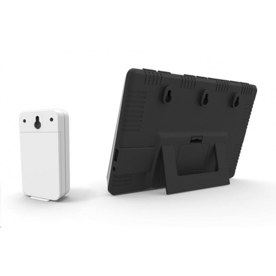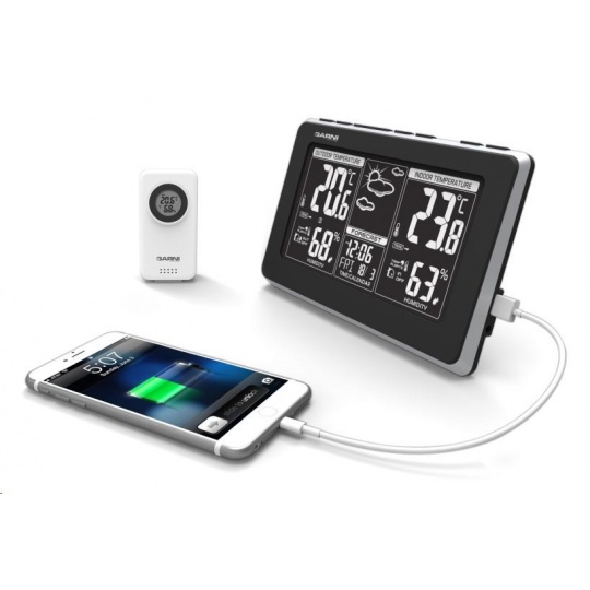 Meteorologická stanice s inverzním LCD displejem s časem řízeným rádiovým signálem DCF-77, budíkem, měřením vnitřní teploty a relativní vlhkosti, bezdrátovým čidlem pro měření vnější teploty a relativní vlhkosti a USB portem pro napájení externích zařízení. Mobilní telefon a USB kabel nejsou součástí balení - inverzní LCD displej o rozměrech 169 x 94 mm s možností stálého osvětlení při napájení síťovým adaptérem, nebo krátkodobým osvětlením na 8 s při napájení bateriemi - dva stupně jasu osvětlení displeje, možnost vypnutí osvětlení displeje (při napájení síťovým adaptérem) - při napájení pouze bateriemi lze displej rozsvítit zvukem, např. klepnutím, tlesknutím apod. - velikost číslic na displeji – čas 12,5 mm, datum a zkratka názvu dne 8 mm, vnitřní a vnější teplota 38 mm, vnitřní a vnější relativní vlhkost 23 mm - čas řízený signálem DCF-77 s možností manuálního nastavení - ikona příjmu signálu DCF-77 - 12ti, nebo 24 hodinový formát zobrazení času - možnost nastavení časového pásma od -12 do +12 hodin - budík s 2 budícími časy s funkcí opakovaného buzení (Snooze) nastavitelného od 3 do 20 minut - budící signál - 10 sekund 1 pípnutí za sekundu, 10 sekund 2 pípnutí za sekundu a poté stálé 4 pípnutí za sekundu - 13 ikon předpovědi počasí v 6 úrovních (jasno, polojasno, oblačno, déšť, bouřky a sněžení) na základě sledování barometrického tlaku vestavěným barometrickým čidlem - zobrazení hodnot vnitřní a vnější teploty a relativní vlhkosti - šipky tendence vývoje vnitřní a vnější teploty - možnost nastavení alarmu horní a dolní meze vnitřní a vnější teploty (akustickým signálem a ikonou na displeji) - zobrazení teploty ve °C, nebo °F - možnost použití až 3 bezdrátových čidel GARNI 040H (jedno je součástí dodávky) - funkce automatického přepínání kanálů - bezdrátový přenos hodnot vnější teploty relativní vlhkosti na frekvenci 433 MHz - ikona příjmu signálu bezdrátového čidla - USB port pro nabíjení mobilních zařízení (pouze při napájení hlavní jednotky síťovým adaptérem), maximální nabíjecí proud 1 000 mA - napájení síťovým adaptérem nebo bateriemi - možnost postavení, nebo zavěšení - barva černá se stříbrnou Bezdrátové čidlo GARNI 040H - vlhkosti odolné, krytí IP44 (odolné proti stříkající vodě) - kruhový displej o průměru 19 mm - velikost číslic na displeji: teplota a relativní vlhkost 5 mm - měření teploty a relativní vlhkosti - 3 kanály - maximální RF výkon 10 dBm (10 mW) - možnost postavení a zavěšení - barva bílá Obsah balení: 1 x hlavní jednotka GARNI 560 EASY II 1 x bezdrátové čidlo GARNI 040H 1 x síťový adaptér český, slovenský, německý, anglický, polský a maďarský návod.