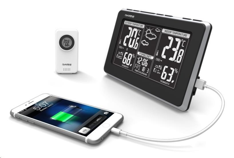 Meteorologická stanice s inverzním LCD displejem s časem řízeným rádiovým signálem DCF-77, budíkem, měřením vnitřní teploty a relativní vlhkosti, bezdrátovým čidlem pro měření vnější teploty a relativní vlhkosti a USB portem pro napájení externích zařízení. Mobilní telefon a USB kabel nejsou součástí balení - inverzní LCD displej o rozměrech 169 x 94 mm s možností stálého osvětlení při napájení síťovým adaptérem, nebo krátkodobým osvětlením na 8 s při napájení bateriemi - dva stupně jasu osvětlení displeje, možnost vypnutí osvětlení displeje (při napájení síťovým adaptérem) - při napájení pouze bateriemi lze displej rozsvítit zvukem, např. klepnutím, tlesknutím apod. - velikost číslic na displeji – čas 12,5 mm, datum a zkratka názvu dne 8 mm, vnitřní a vnější teplota 38 mm, vnitřní a vnější relativní vlhkost 23 mm - čas řízený signálem DCF-77 s možností manuálního nastavení - ikona příjmu signálu DCF-77 - 12ti, nebo 24 hodinový formát zobrazení času - možnost nastavení časového pásma od -12 do +12 hodin - budík s 2 budícími časy s funkcí opakovaného buzení (Snooze) nastavitelného od 3 do 20 minut - budící signál - 10 sekund 1 pípnutí za sekundu, 10 sekund 2 pípnutí za sekundu a poté stálé 4 pípnutí za sekundu - 13 ikon předpovědi počasí v 6 úrovních (jasno, polojasno, oblačno, déšť, bouřky a sněžení) na základě sledování barometrického tlaku vestavěným barometrickým čidlem - zobrazení hodnot vnitřní a vnější teploty a relativní vlhkosti - šipky tendence vývoje vnitřní a vnější teploty - možnost nastavení alarmu horní a dolní meze vnitřní a vnější teploty (akustickým signálem a ikonou na displeji) - zobrazení teploty ve °C, nebo °F - možnost použití až 3 bezdrátových čidel GARNI 040H (jedno je součástí dodávky) - funkce automatického přepínání kanálů - bezdrátový přenos hodnot vnější teploty relativní vlhkosti na frekvenci 433 MHz - ikona příjmu signálu bezdrátového čidla - USB port pro nabíjení mobilních zařízení (pouze při napájení hlavní jednotky síťovým adaptérem), maximální nabíjecí proud 1 000 mA - napájení síťovým adaptérem nebo bateriemi - možnost postavení, nebo zavěšení - barva černá se stříbrnou Bezdrátové čidlo GARNI 040H - vlhkosti odolné, krytí IP44 (odolné proti stříkající vodě) - kruhový displej o průměru 19 mm - velikost číslic na displeji: teplota a relativní vlhkost 5 mm - měření teploty a relativní vlhkosti - 3 kanály - maximální RF výkon 10 dBm (10 mW) - možnost postavení a zavěšení - barva bílá Obsah balení: 1 x hlavní jednotka GARNI 560 EASY II 1 x bezdrátové čidlo GARNI 040H 1 x síťový adaptér český, slovenský, německý, anglický, polský a maďarský návod.